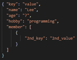 Javascript 객체 리터럴 문법을 따르는 문자열로 js의 데이터 타입 + 다른 객체를 포함한다