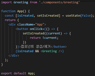 위에서 버튼을 클릭해서 state의 값을 true로 바꿔주었기 때문에 <Greeting /> 컴포넌트를 호출