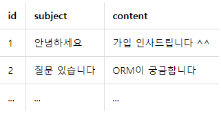 question = Question(subject="질문 있습니다", content"ORM이 궁금합니다")