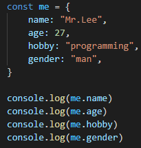 me 변수 안에서 각 요소에 대해 이름, 나이, 취미, 성별과 같이 정의 후 데이터를 할당해주었기 때문이다