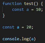 test라는 변수 안에서 a = 10, 밖에서 a = 20을 할당해주었다