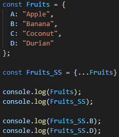 지금까지 살펴본 전개 구문이 아닌, 객체 데이터를 가진 Fruits 변수 자체를 Fruits_SS에 할당