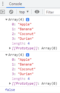 하지만, 둘은 서로 다른 독립적인 배열임을 마지막 console.log 비교문을 통해 확인할 수 있다