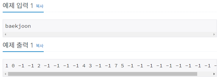 각각의 알파벳에 대해서, a가 처음 등장하는 위치, b가 처음 등장하는 위치, ... z가 처음 등장하는 위치를 공백으로 구분해서 출력한다. 만약, 어떤 알파벳이 단어에 포함되어 있지 않다면 -1을 출