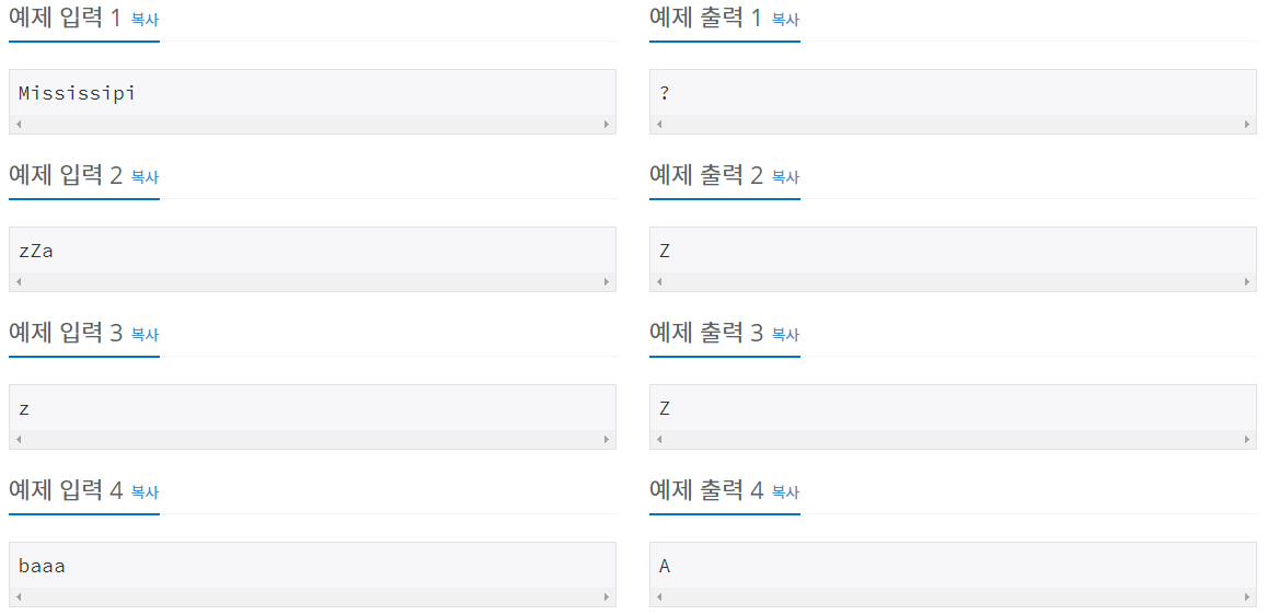 단, 가장 많이 사용된 알파벳이 여러 개 존재하는 경우에는 ?를 출력한다.