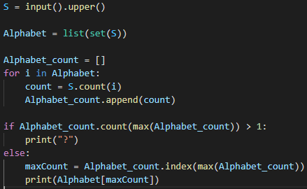 알파벳 대소문자로 된 단어가 주어지면, 이 단어에서 가장 많이 사용된 알파벳이 무엇인지 알아내는 프로그램을 작성하시오. 단, 대문자와 소문자를 구분하지 않는다.