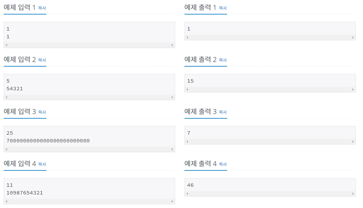 연속된 숫자로 이루어진 하나의 숫자를 모두 더한 값을 출력하는 문제