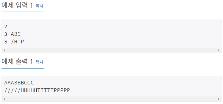 문자열 S를 입력받은 후에, 각 문자를 R번 반복해 새 문자열 P를 만든 후 출력하는 프로그램을 작성하시오.