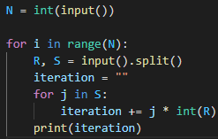 문자열 S를 입력받은 후에, 각 문자를 R번 반복해 새 문자열 P를 만든 후 출력하는 프로그램을 작성하시오. 즉, 첫 번째 문자를 R번 반복하고, 두 번째 문자를 R번 반복하는 식으로 P를 만들면 된다